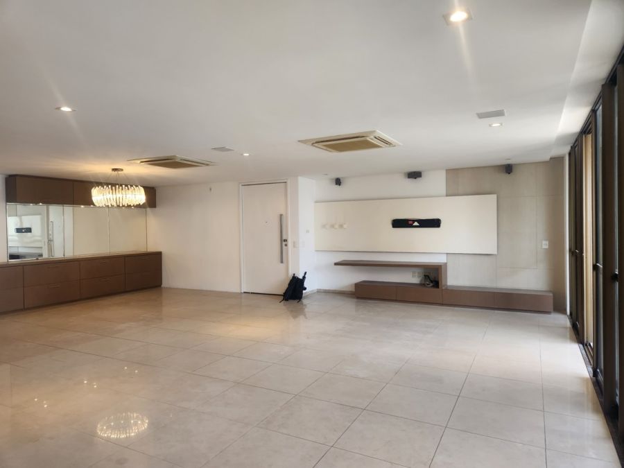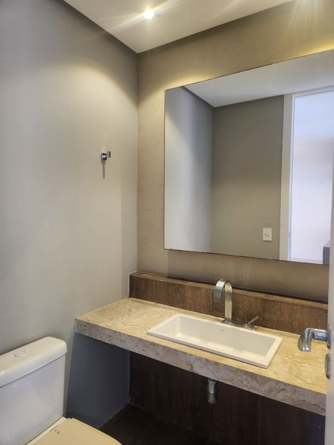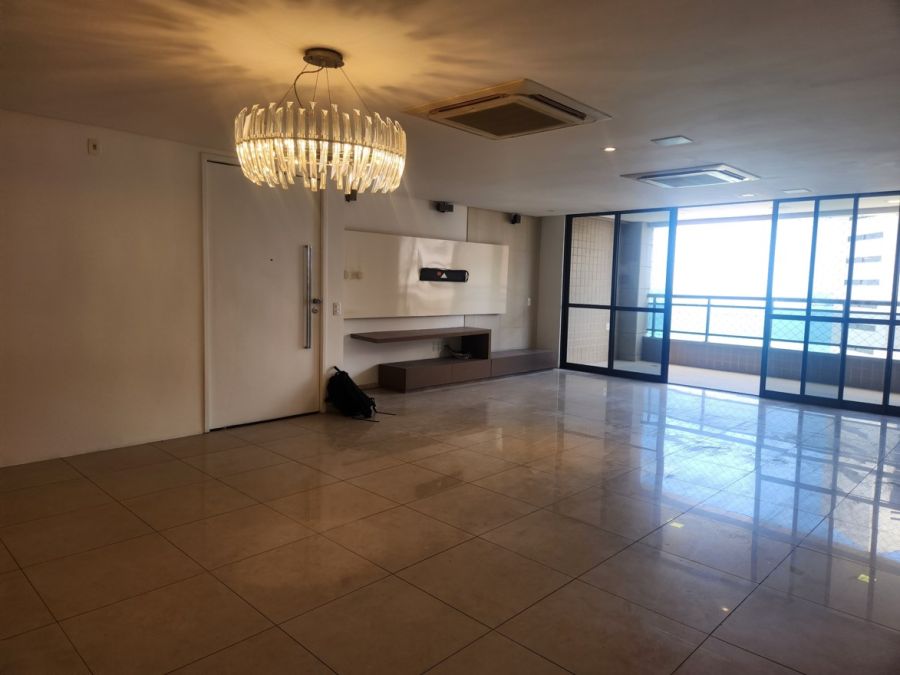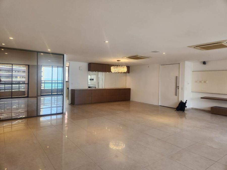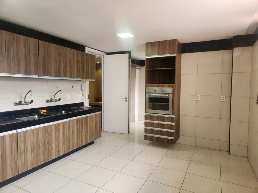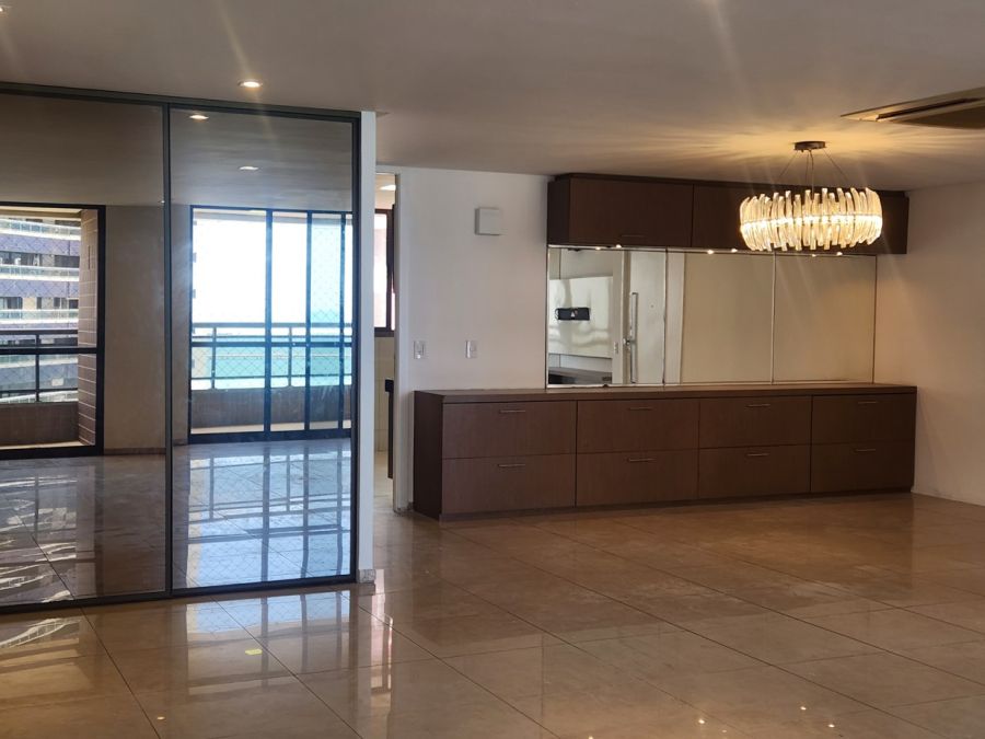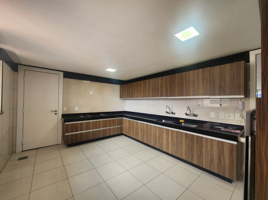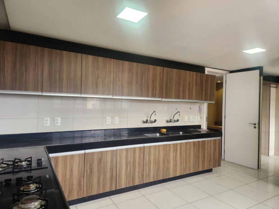 O apartamento conta com acabamentos de alto padrão, cozinha planejada, lavabo elegante, piso em porcelanato, lustres e espelhos decorativos, ares condicionados e elevador privativo. Dispõe ainda de área de serviço, dependência completa de empregada e quatro vagas de garagem.