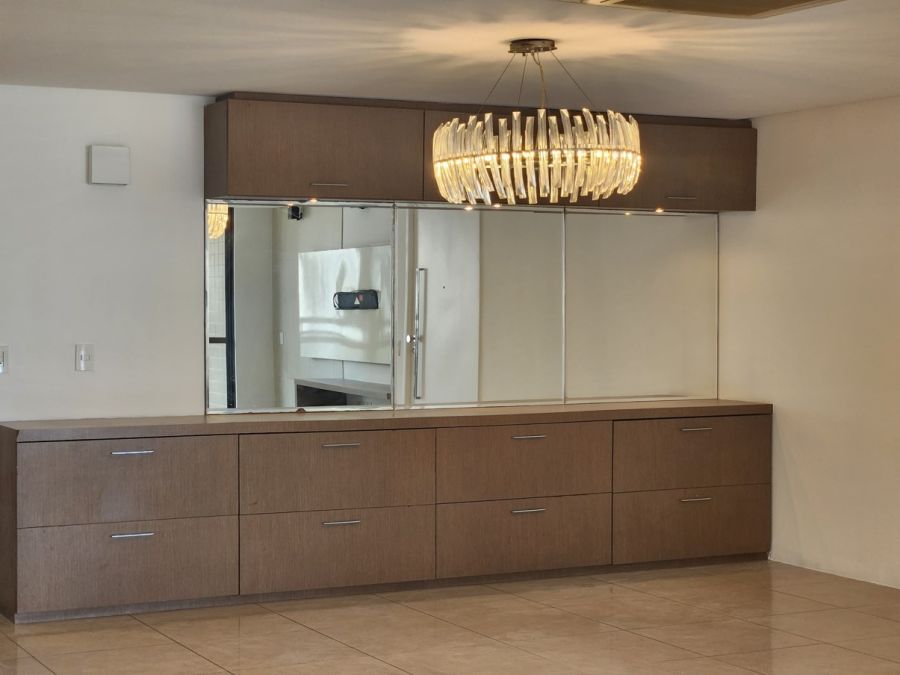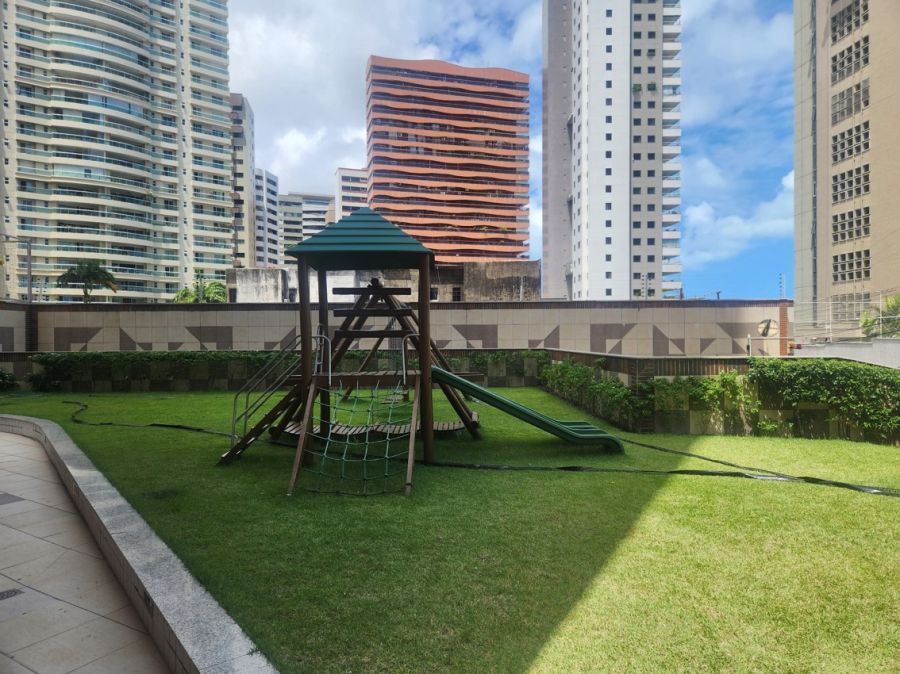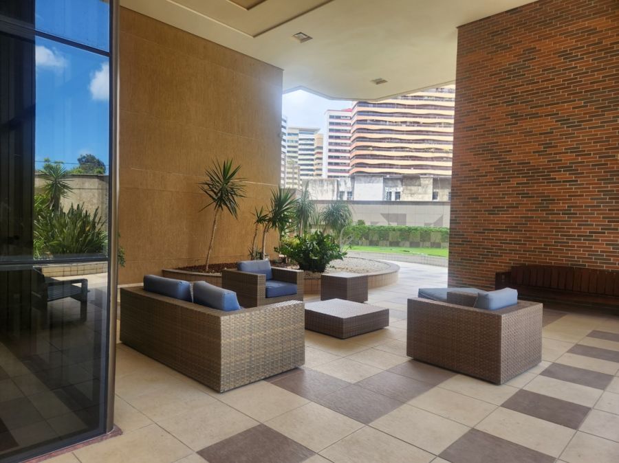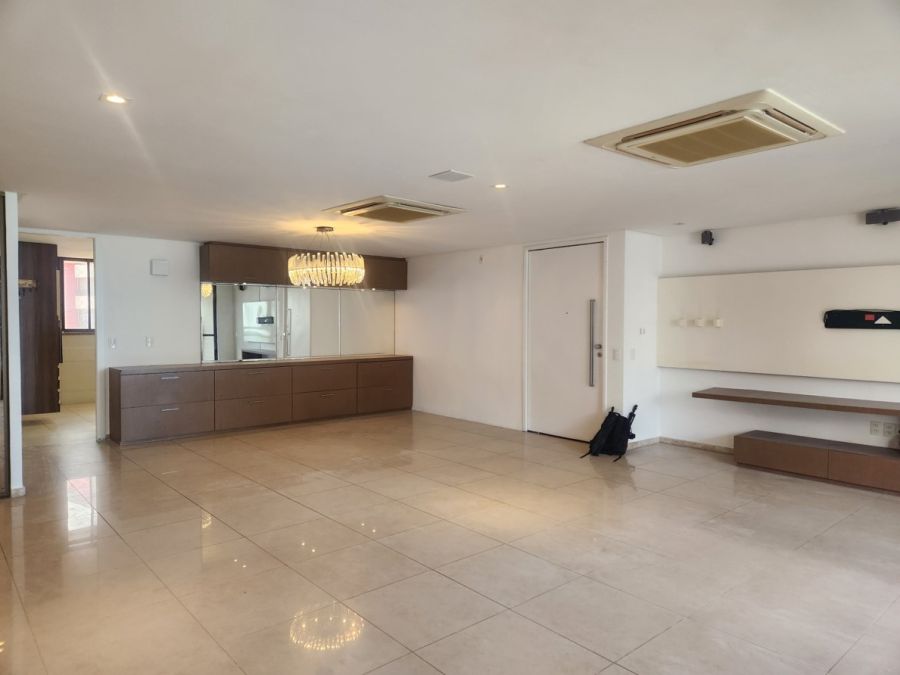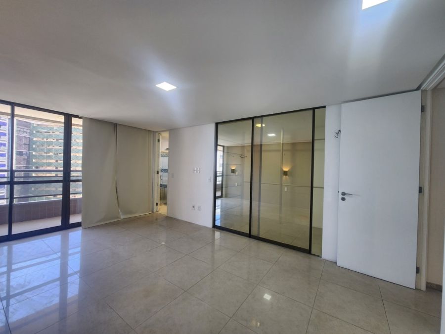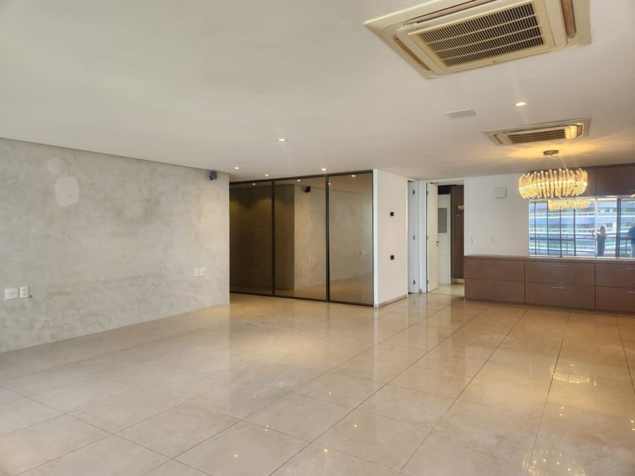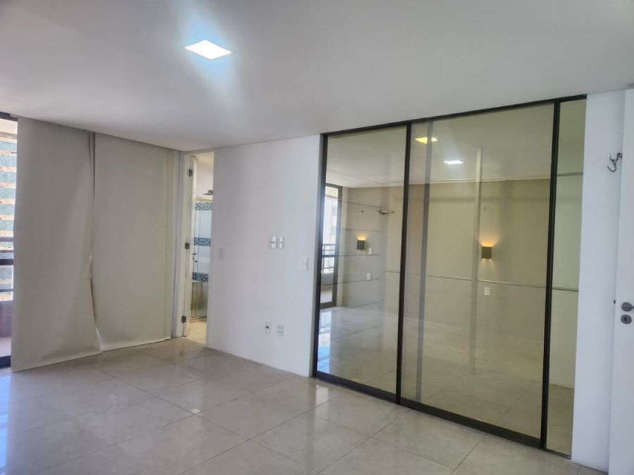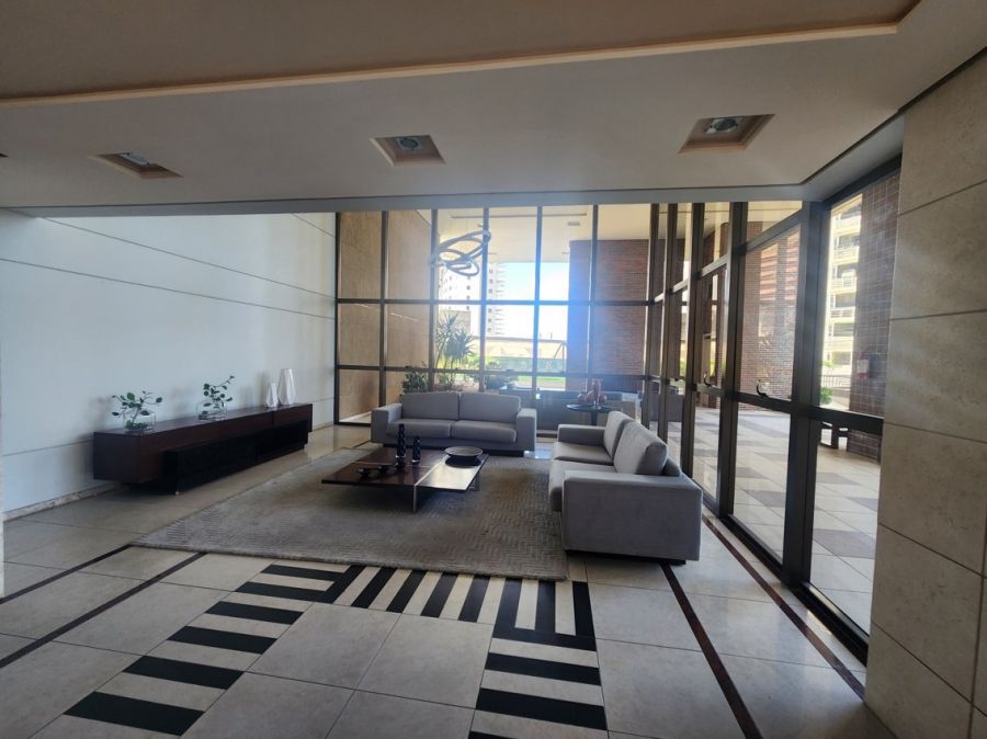 O apartamento conta com acabamentos de alto padrão, cozinha planejada, lavabo elegante, piso em porcelanato, lustres e espelhos decorativos, ares condicionados e elevador privativo. Dispõe ainda de área de serviço, dependência completa de empregada e quatro vagas de garagem.